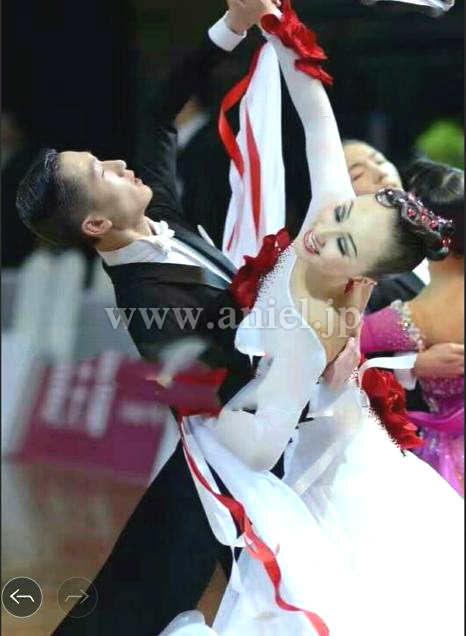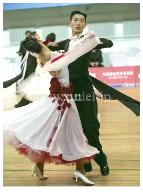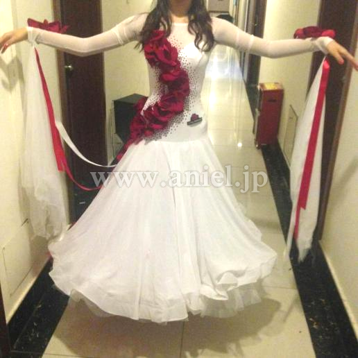 純白のボディに深紅の薔薇の装飾がエレガントなドレスです。