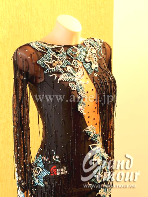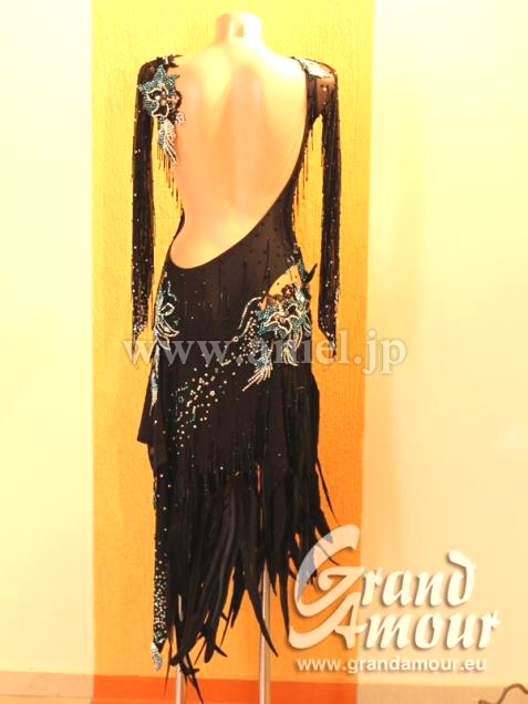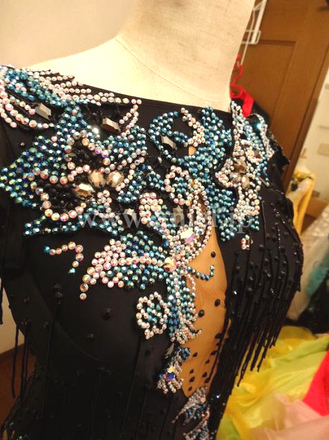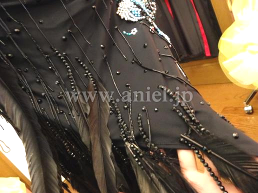 長袖ですが背中全部と脇腹がえぐれていて、決して露出は少なくないドレスです。スカートは写真では形状があまり伝わりませんが、アシンメトリーな形になっており、立っている時はタイトなイメージですが、動くとよく広がります。羽が大人っぽい印象を与えてくれます。ストーンが大量についていて青の石の色がきいています。スカートには高級フェザーを使用。