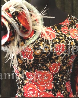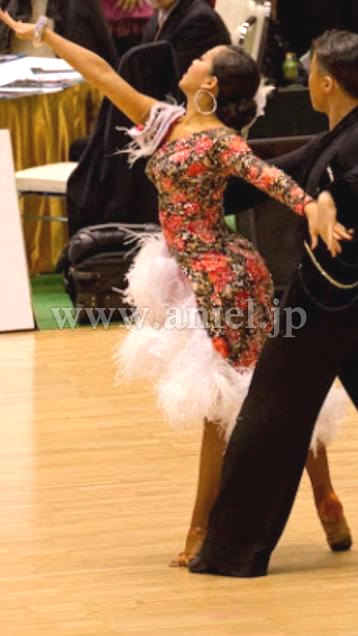 オーガンジーフリルのスカートが良く踊ります。裾はラメ入りのソフトボーンで縁取られていて、フリル全体に白のオーストリッチの羽があしらわれています。