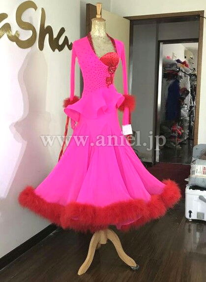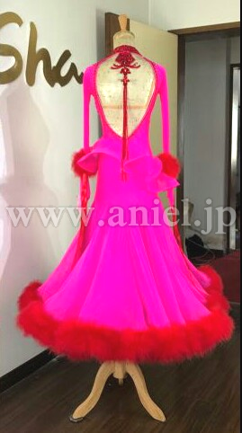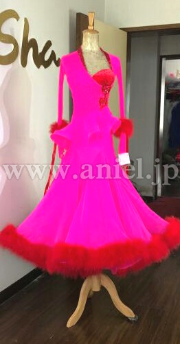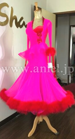 ペプラムスタイルのボディデザイン。赤の羽根がピンクとよくマッチしています。
