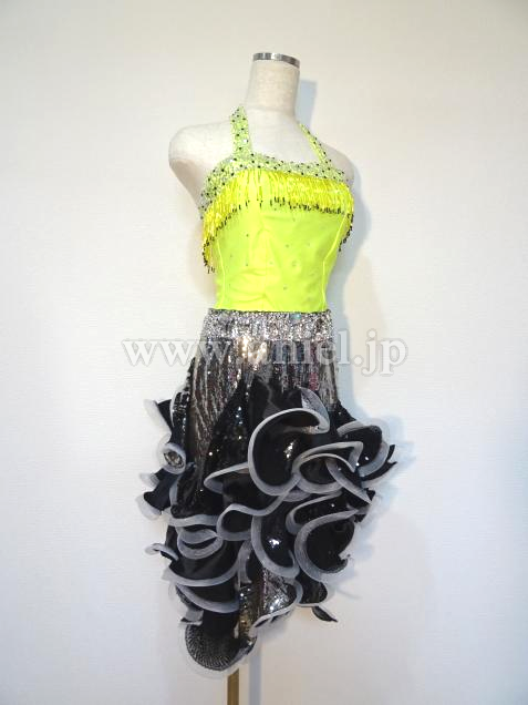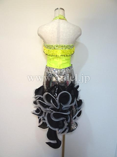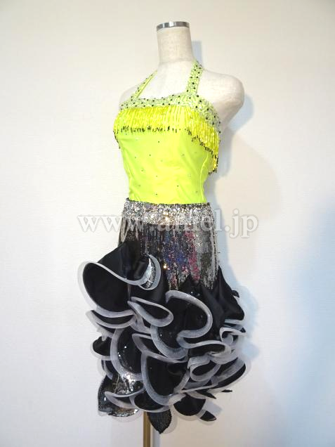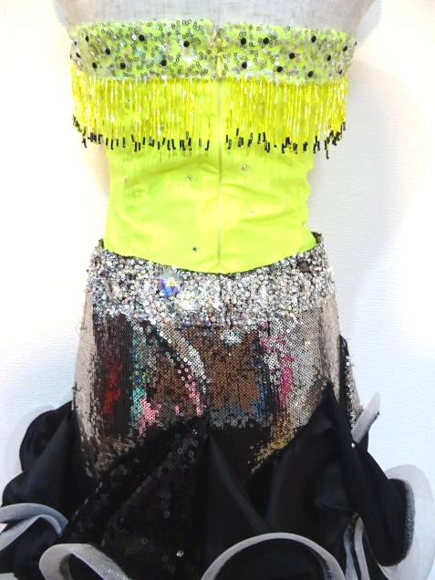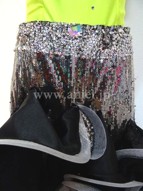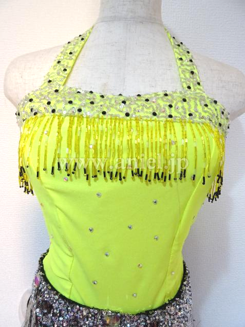 セパレーツのジャンティのスカート部分に黄色の上半身をつけてワンピースにしました。露出は少なく、胸元には竹ビーズがぐるっとついています。スカートには、3種類の布にホースレースがついていて、踊ります。ウエスト部分は、石が沢山ついていて、ベルトのように見えます。髪飾り用コサージュ、腕と手首のバングルがあります。