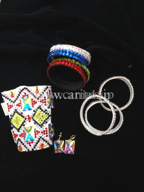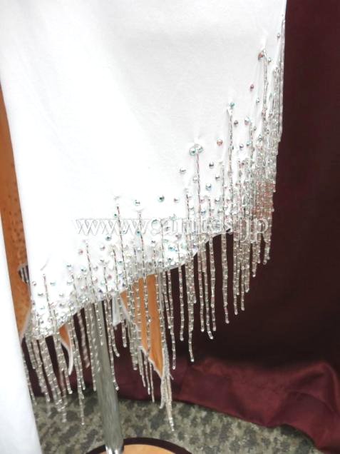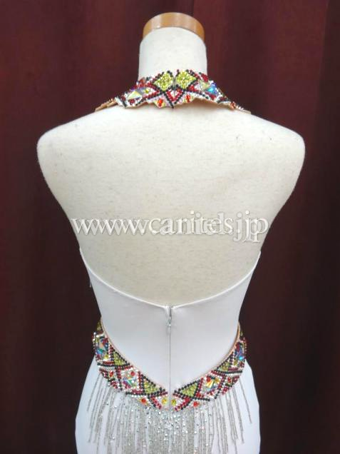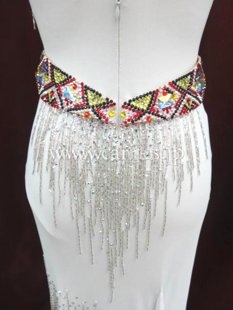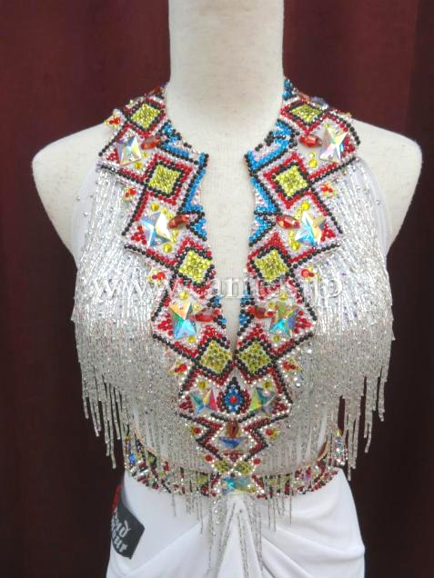 カラフルな部分は以前Grand Amour がスポンサーしているVera Bondarevaが着用していたドレスの再利用になります。このカラフルな模様は、ウクライナの伝統刺繍と同じモチーフで作られた、彼らのアイデンティティを象徴するようなドレスです。潔いほどにすっっきりとしたラインに、シルバーのツイストビーズフリンジがびっしり付いた胸元とヒップ、純白のドレスにカラフルなアクセサリーがとても目立ちます。デモ、もしくはファイナルドレスとして着ていただくのにふさわしい感じですが、もちろん競技でも着用いただけます。個性的で美しいドレスです。
