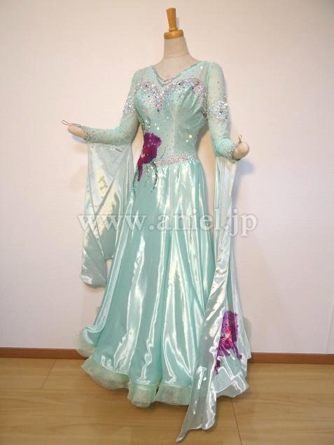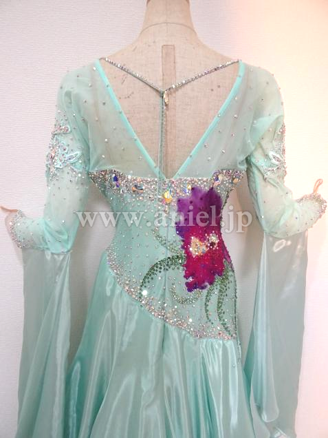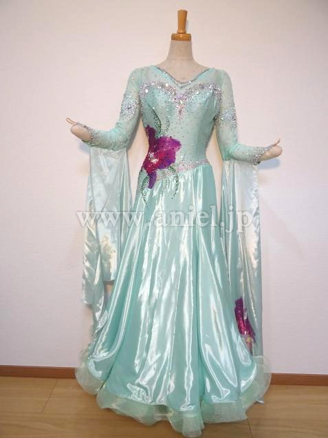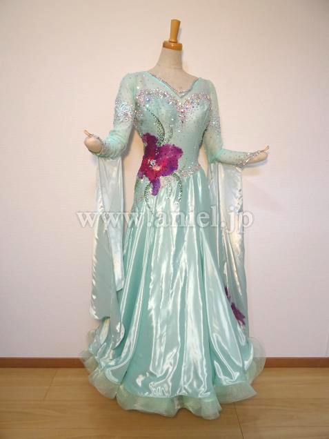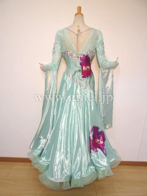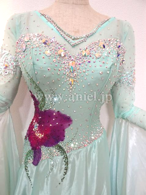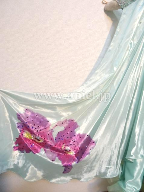 爽やかなペパーミントカラーに大きな花が印象的なドレス。