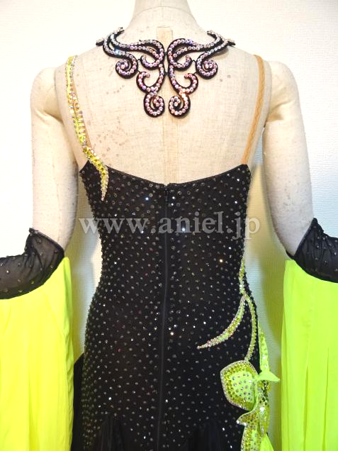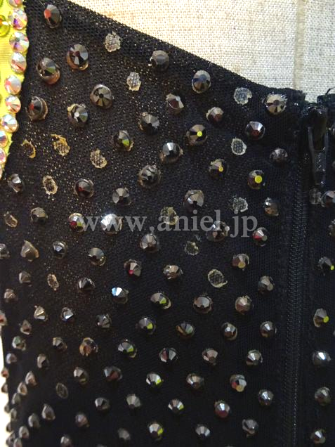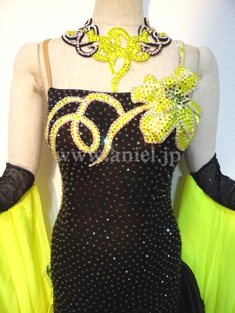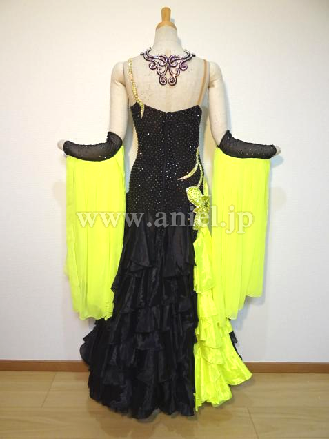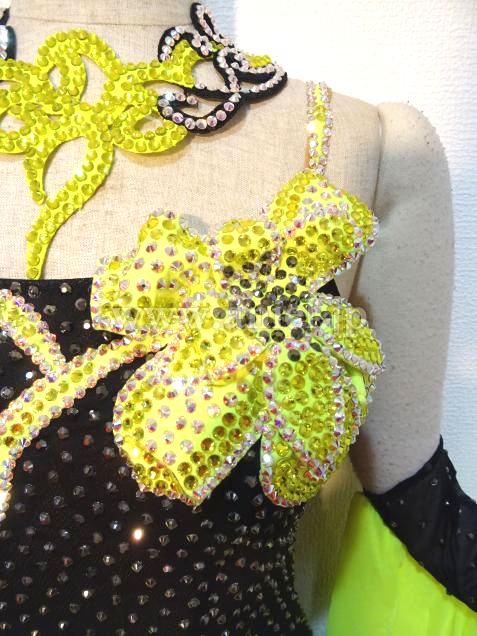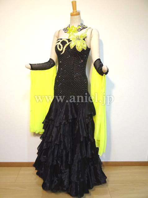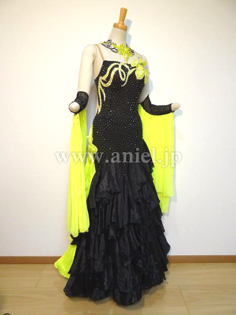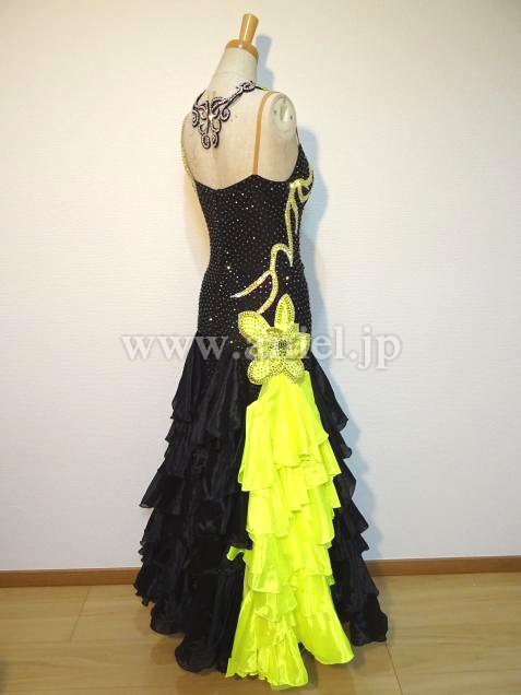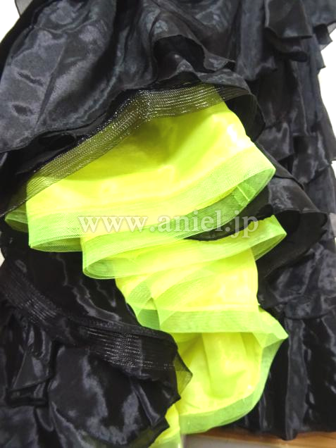ティアードスカートですのでボリュームが出ます。見た目以上に軽くて良く動きます。差し色のイエローが発色がよくフロアで映えます。