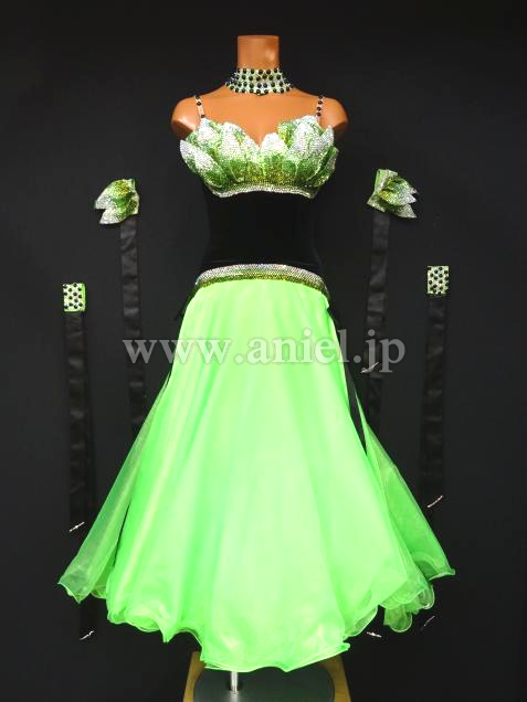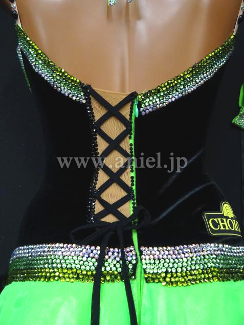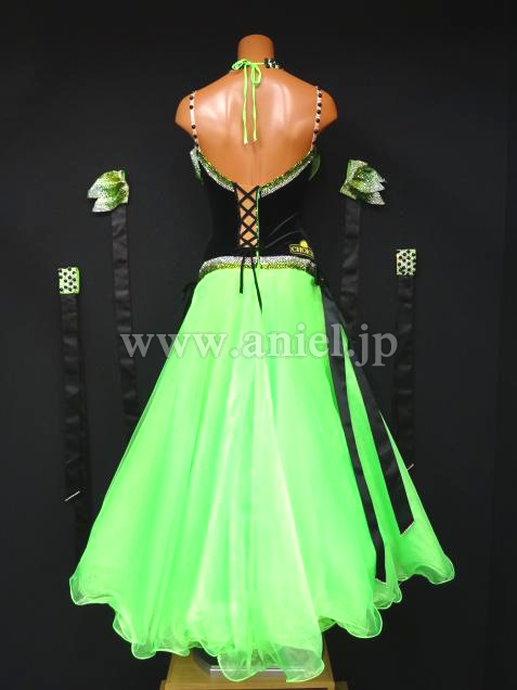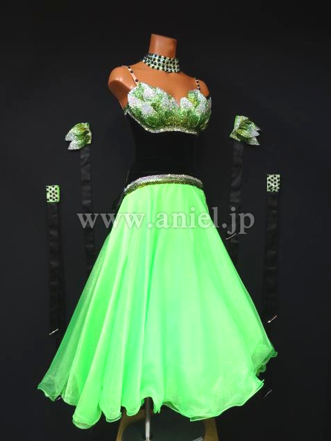 発色の良い、グリーンとベルベット素材のドレス。