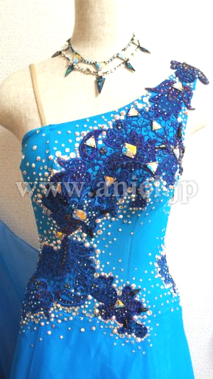 ワンショルダーです。レースと石でびっしり装飾してあります。