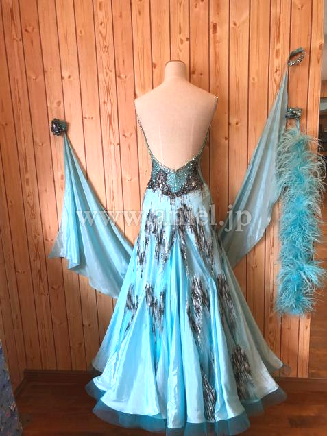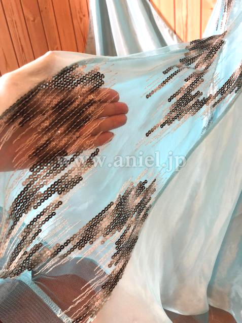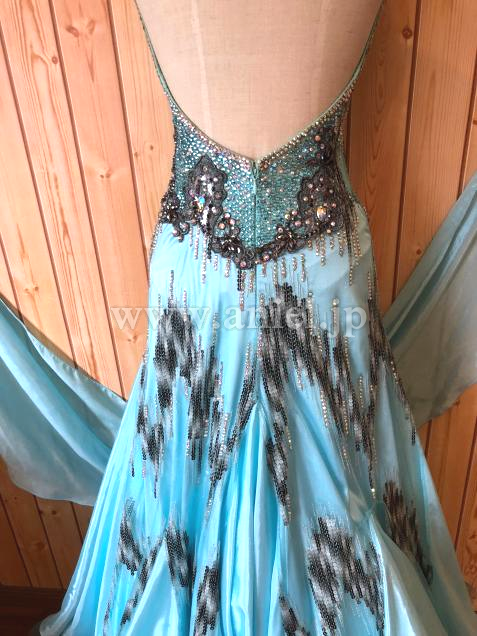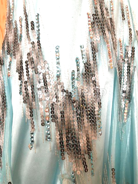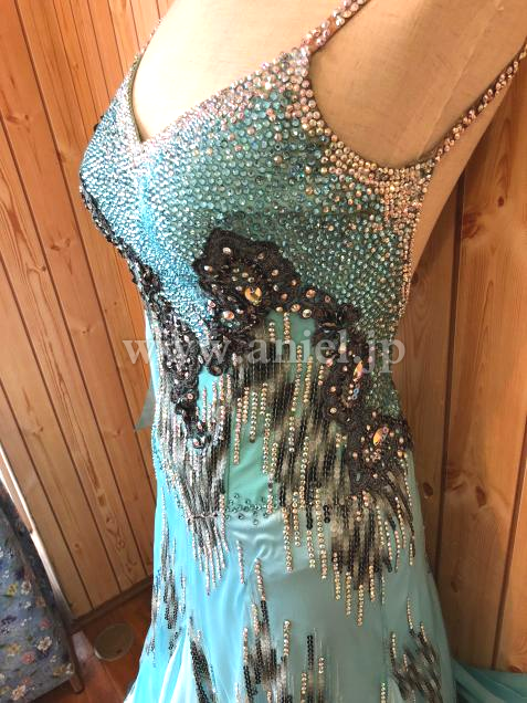 グラデーションカラーのスパンコール&ラインストーンの装飾がとても個性的で、目を惹くエレガントなドレスです。