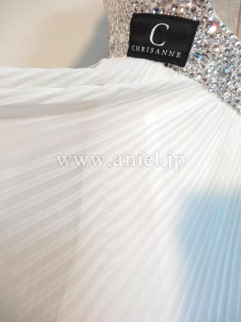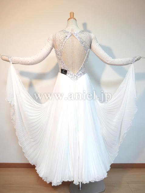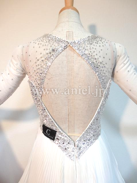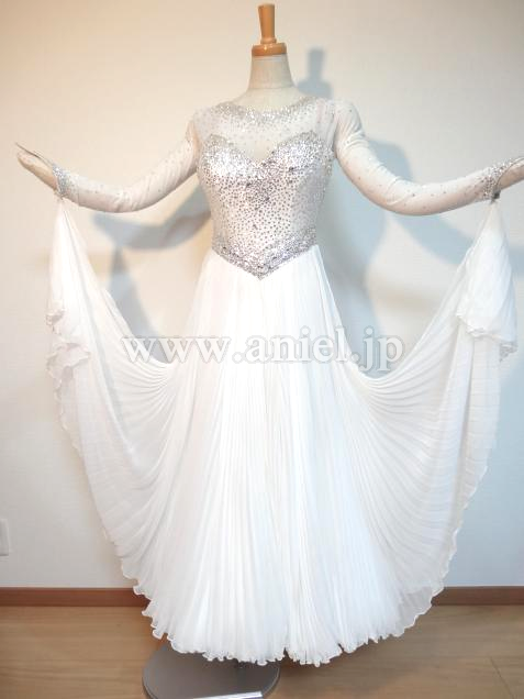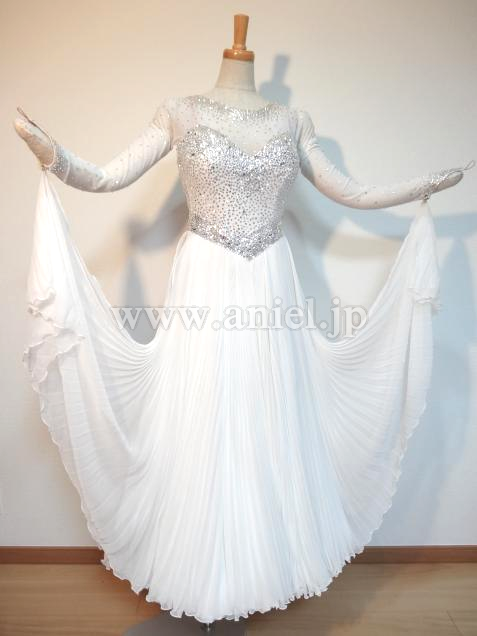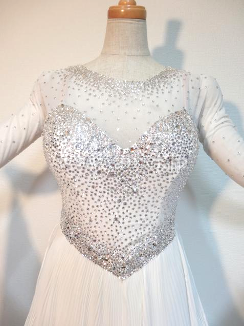 ボディにびっしりと貼られたスワロフスキーが豪華で、とても品の良いドレスです。美しいプリーツのスカートからつながったフロートもよく踊ります。