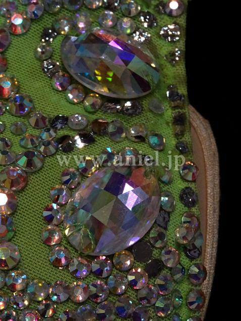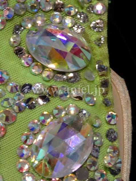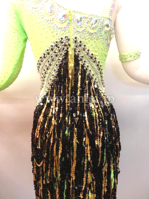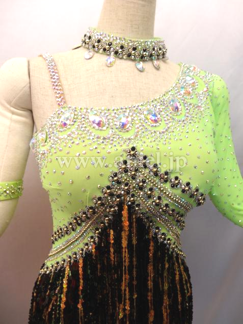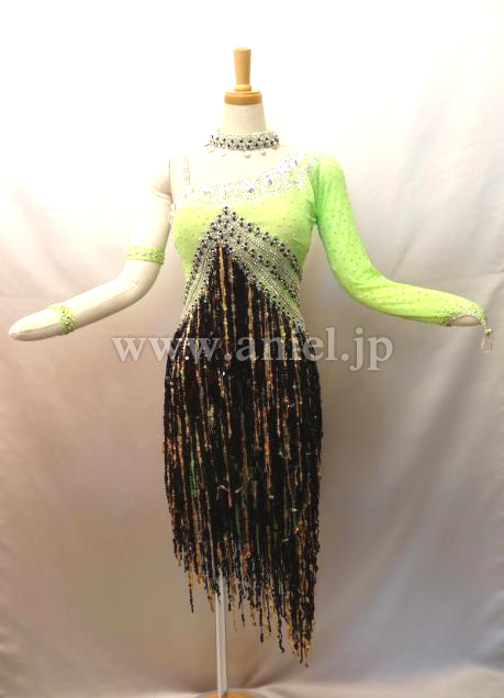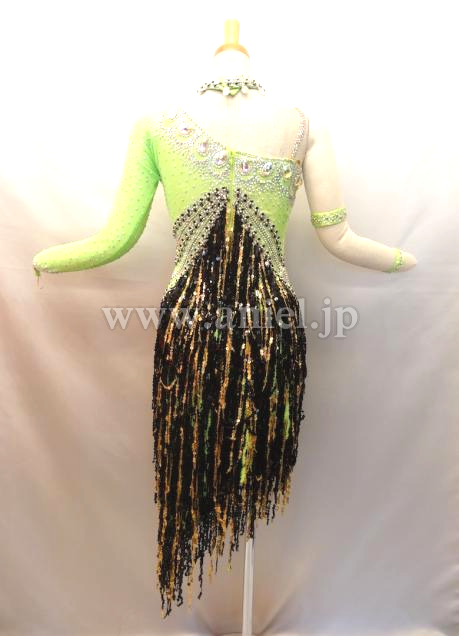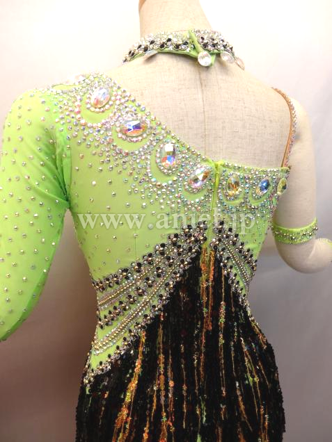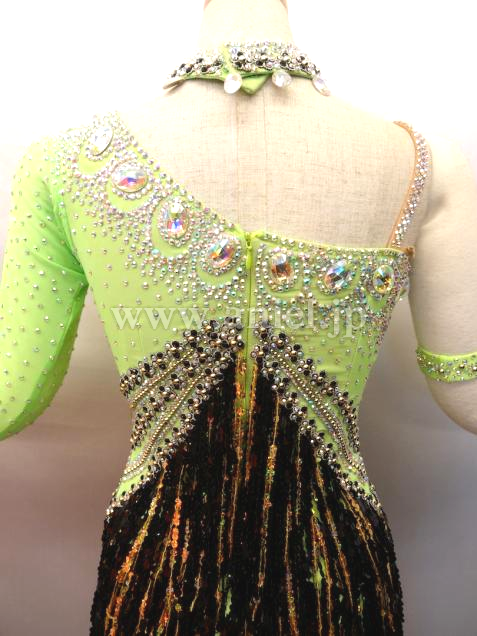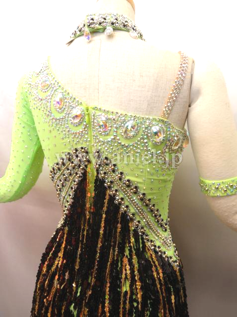 とても綺麗なグリーンです。ワンショルダーなのでデコルテラインが綺麗に見えます。バスト中央からウエストにかけて ストーンとゴールド、ブラックのスパンコールフリンジが配置されて とてもスタイル良く足が長く見え、フリンジが良く踊ります。背中があまり空いていないので 露出を控えたい方にぴったりです。 チョーカー1点 バングル大小各1点 よびのストーンが少々付いています。 スパンコールが少々落ちていますが見た目分かりません。 アンダーショウツクラッチ部分開閉式。