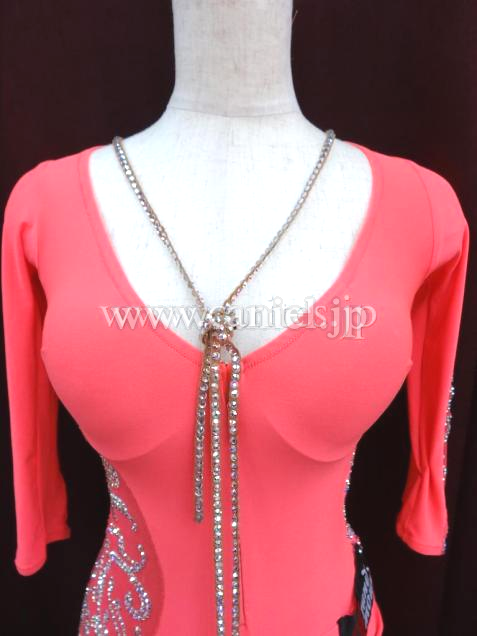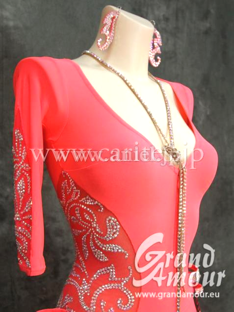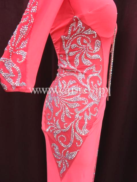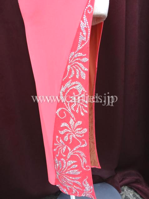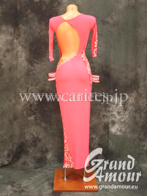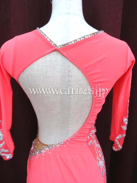 ありの部分と石無しの部分はそれぞれ同じカラーですが違う種類の生地を使っており、トーンの違いが面白いです。アシンメトリーに開いた背中はヒップの曲線を強調したデザインで、後ろ姿を美しく見せてくれます。