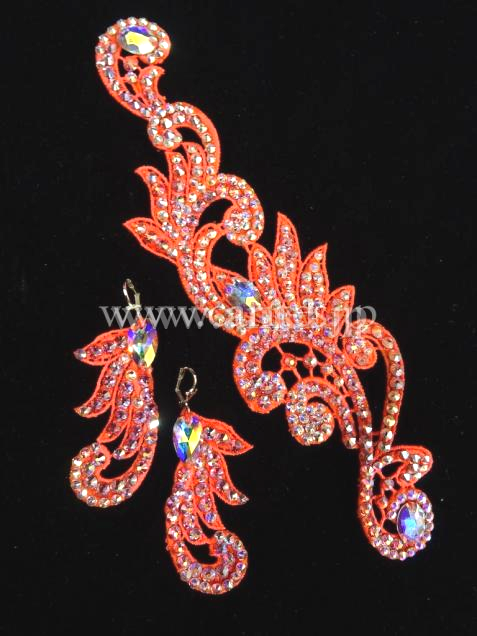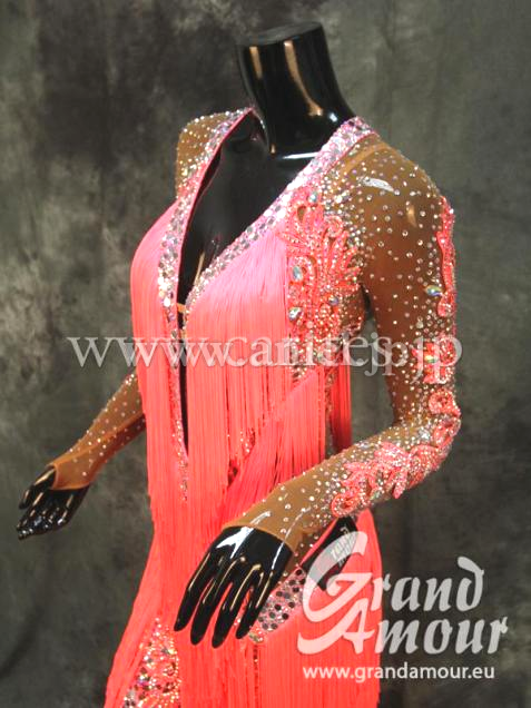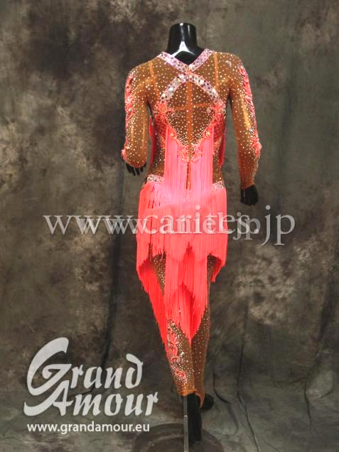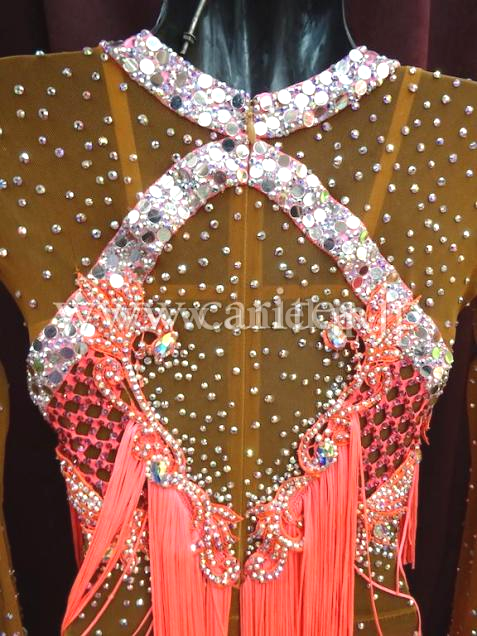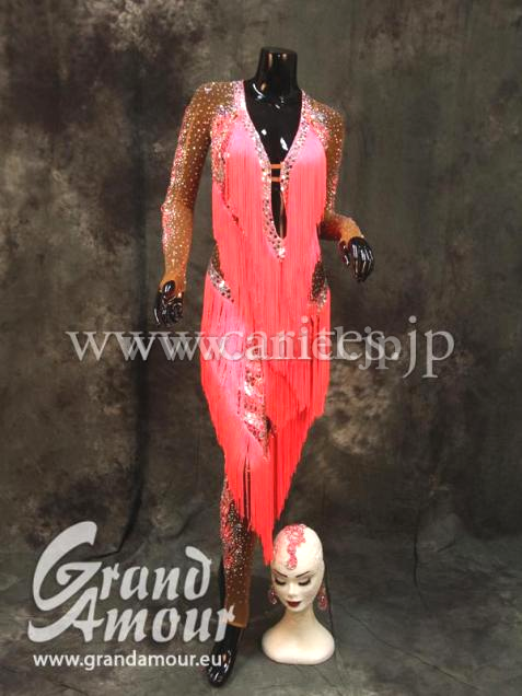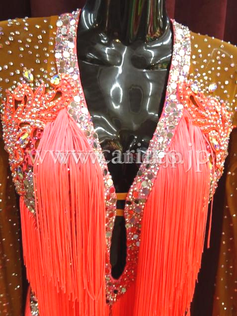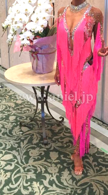珍しいパンツドレス。足元はベージュのネットのため、素足に見えます。袖やパンツにもびっしりとたくさんの石がちりばめられていて、全身きらきらするのでとても人目を引きます。胸元から足まで斜めに付けられたフリンジがよく踊ります。他にはない面白いドレスで、インパクト大です。デモにも競技会にも向いています。