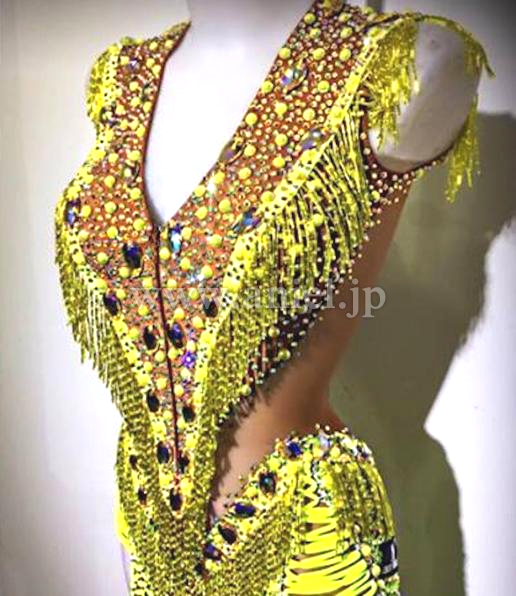 スカートには網の生地をデザインで使用しています。大きなスリットが入り、動きが大きく出やすい形です。