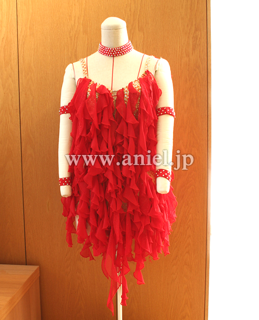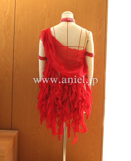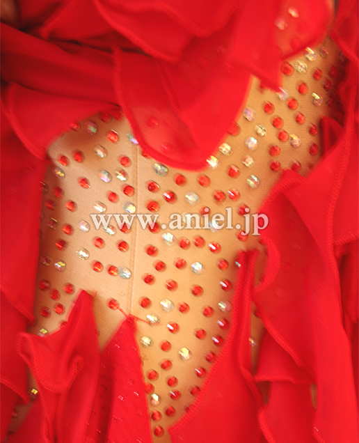 地のレオタードには、多数のアクリルストーンが貼られており、フリルが動けばストーンの輝きが露出します。とてもフロア映えするドレスです。