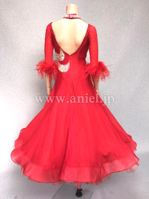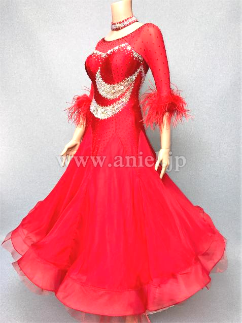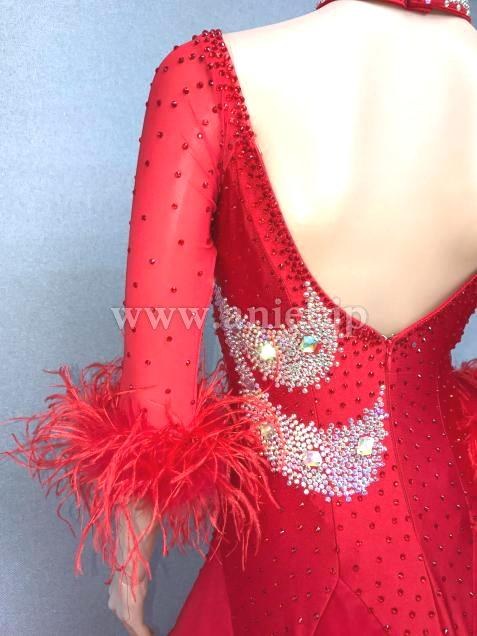 袖口のオーストリッチファーと、ウエストを細く見せるラインストーンデザインが