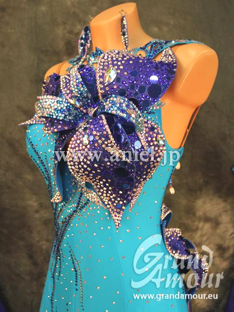 胸元とヒップには立体のハンドメイドフラワーモチーフがあしらわれ、ミラーやストーンで芸術的に飾られ非常に豪華です。