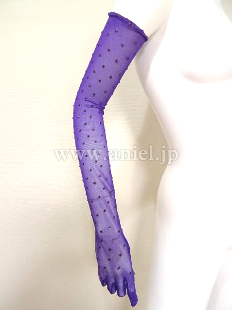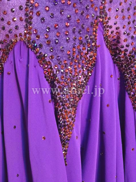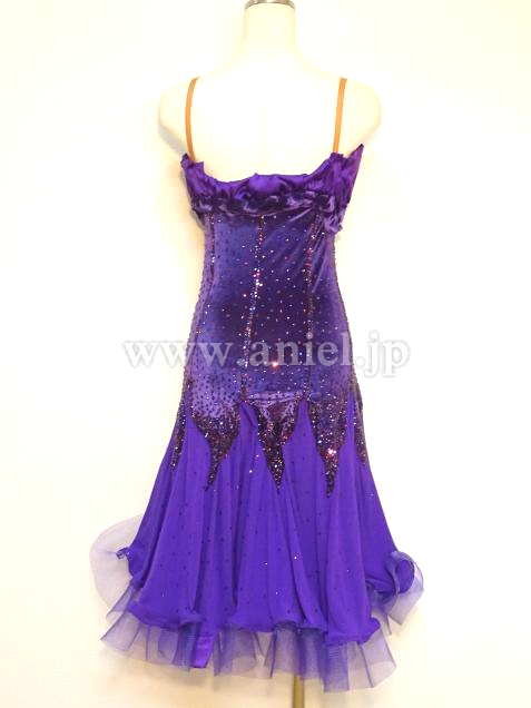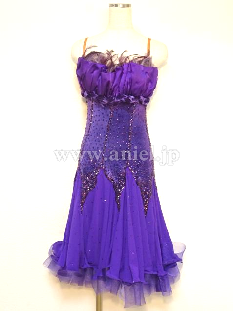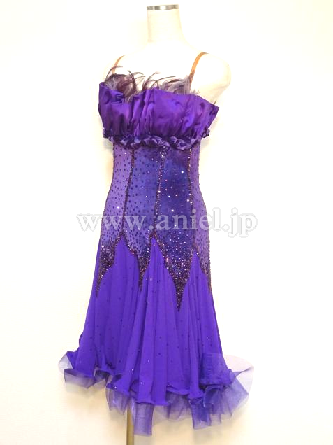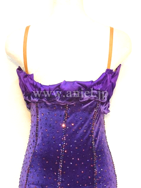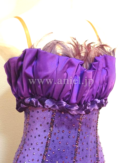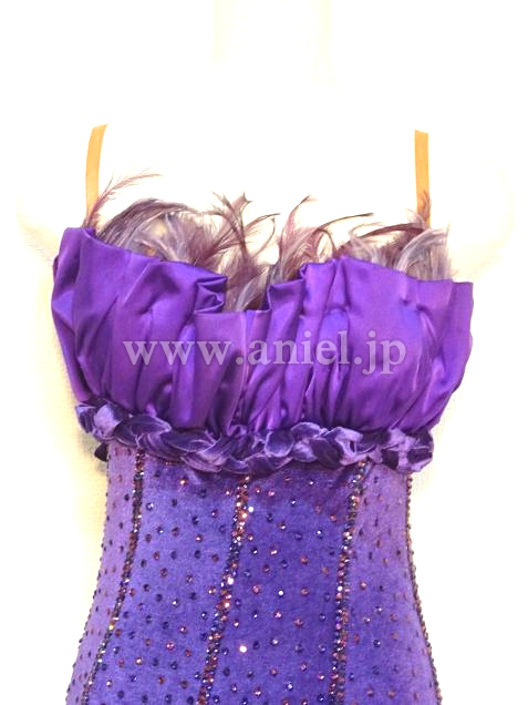 胸元に羽根を使用し、ボリュームが出ます。ベルベット素材のボディにストーンを使用しています。