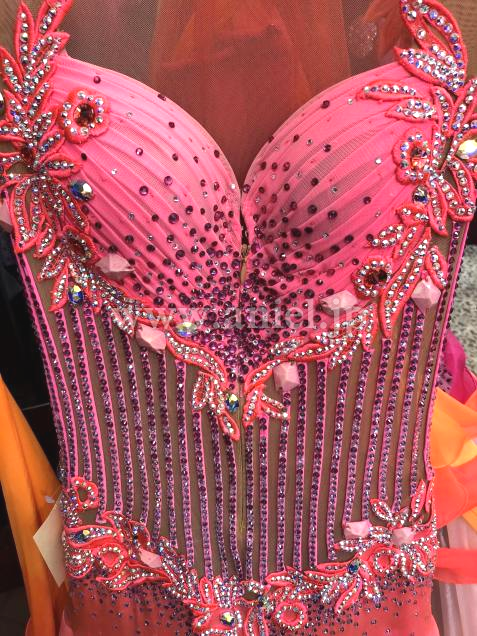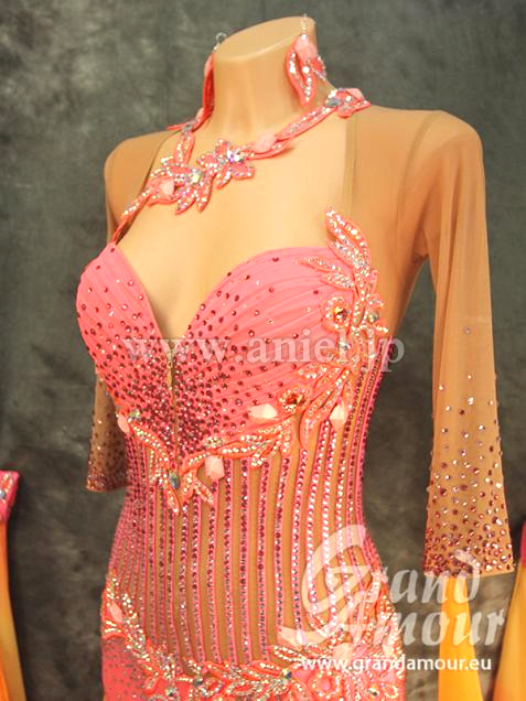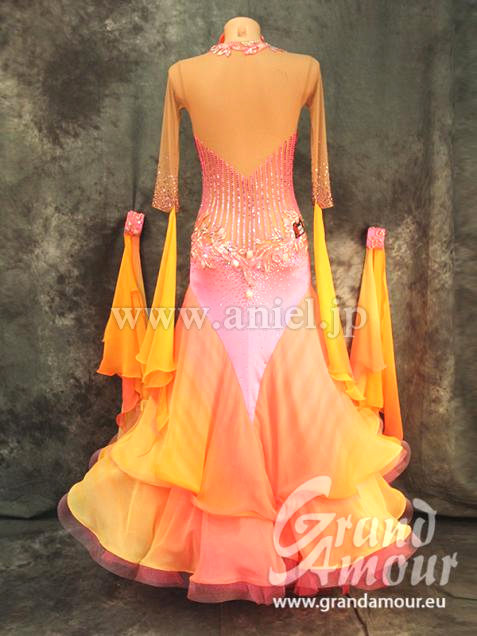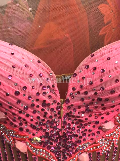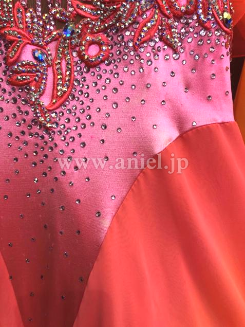 ウエスト上、縦に流れるラインがボディを細く見せてくれます。スカートはピンク〜黄色へのグラデーションに染めてあります。柔らかいシフォン素材のスカートです。アクセサリーはもともとピアスだったものを、イヤリングへ変更しています。