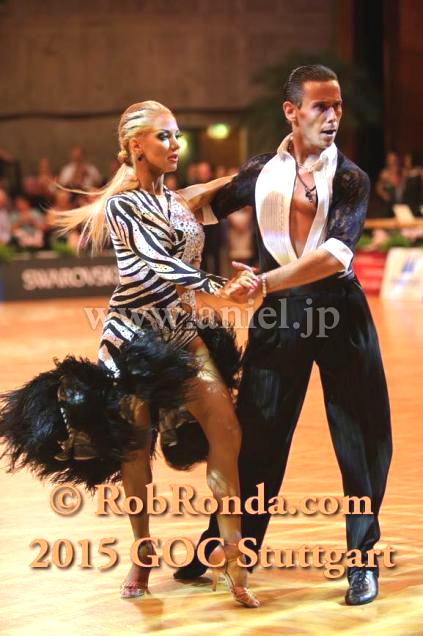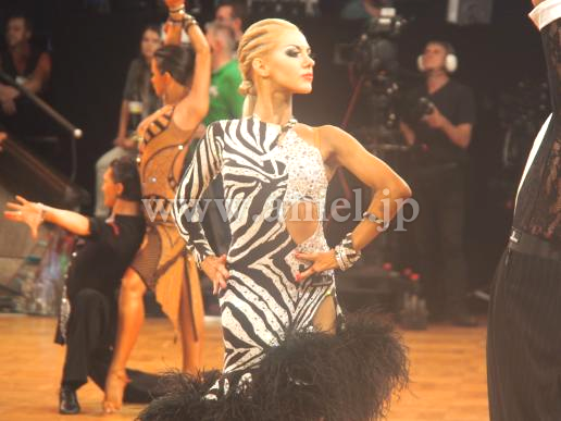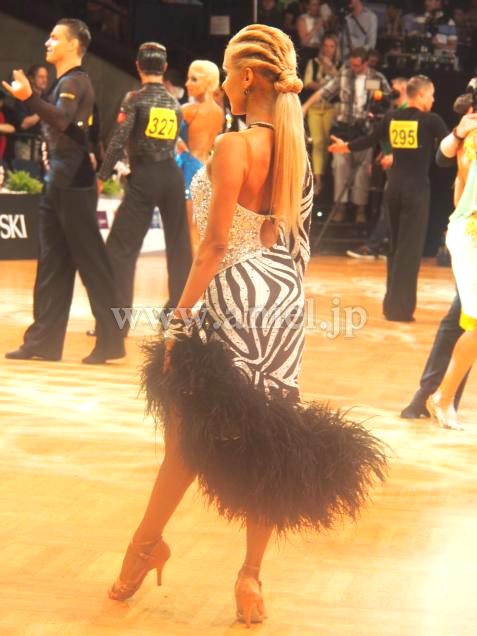 ワンショルダーでゼブラ柄、フレアスカートにオーストリッチの羽が付いており、よく踊ります。ボディは、白い生地部分にクリスタルのストーンで装飾されています。