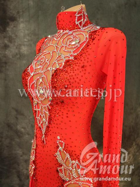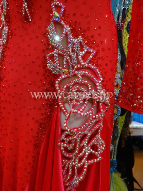 真っ赤なハイネックの長袖。デコルテと足のライン、背中には豪華にバラのハンドメイドレースがあしらわれています。フロント部分の足は出ますが、ほとんど覆われているので露出を気にされる方にも着ていただけます。本物は写真よりもキラキラしています。