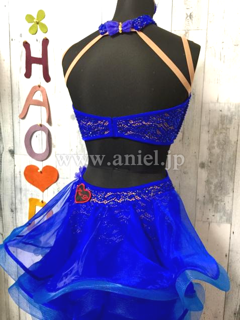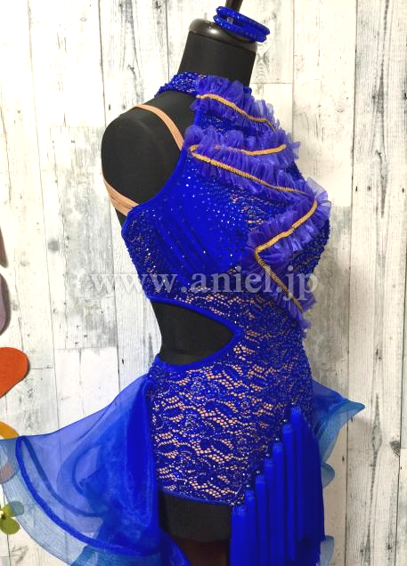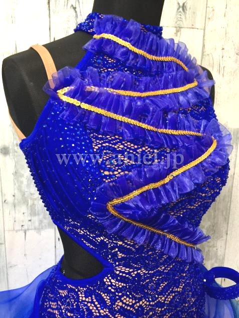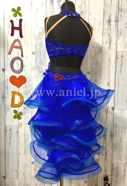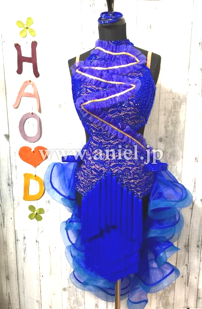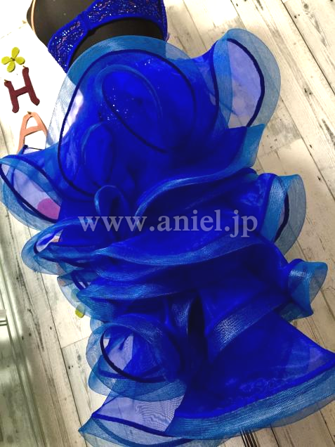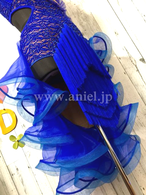 前後アシメトリーなデザイン、前はタッセルと3段フリンジでスピーディーなイメージ、後はフリルたっぷりなディヤードで可愛く、色んな表情を見せる