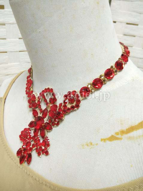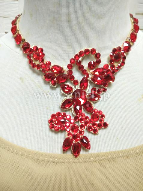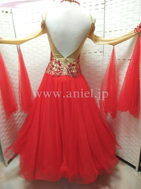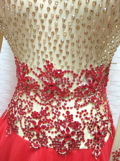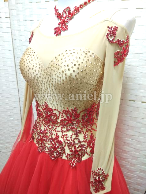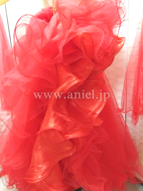 鮮やかな赤のスカートがボリュームたっぷりのドレスです。