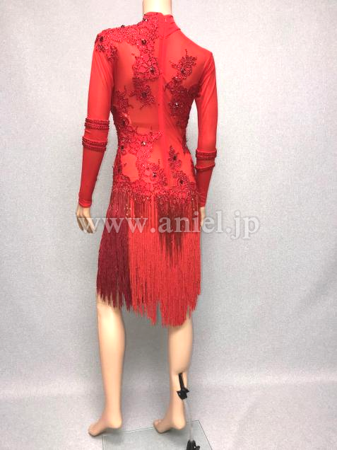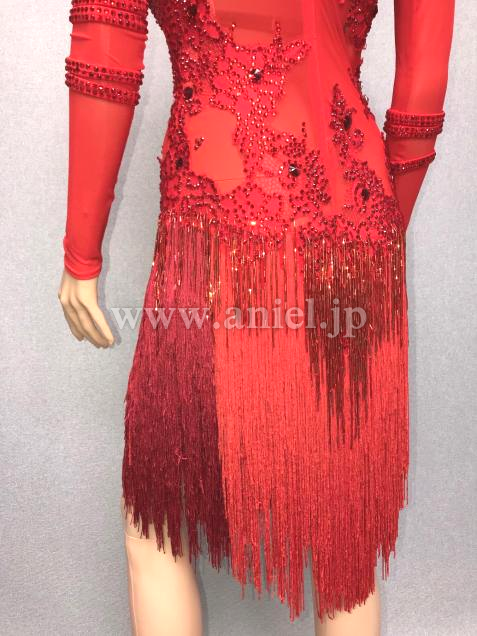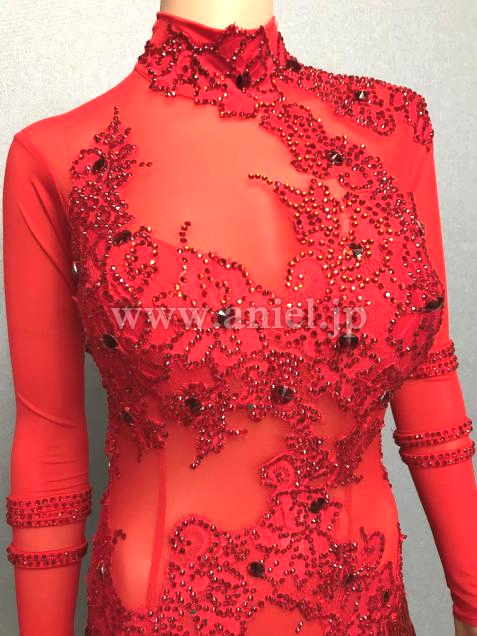 2重のスパンデックス地でバスト、ヒップを覆い、ドレス全体を赤のストレッチメッシュにレッドフラワーモチーフを