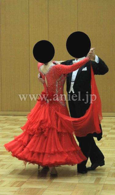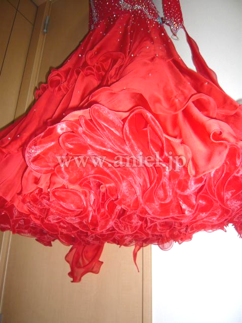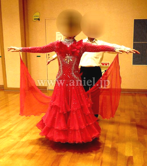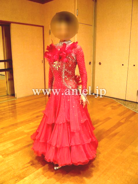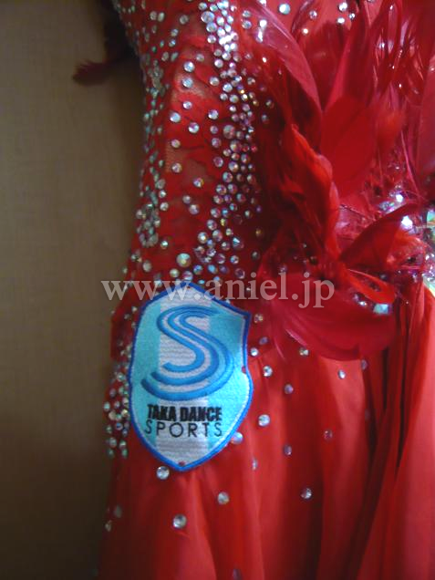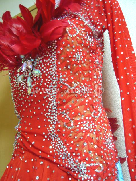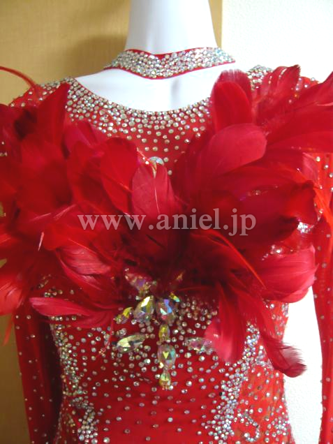 胸と腰に羽が装飾されており、競技会でも着用できるとても豪華なドレスです。