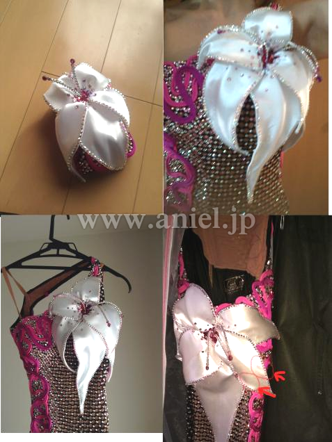 購入後、胸元とヒップとアーム飾りに、ストーンで縁取られた艶のある白い花びらとストーンでつくった花弁の立体的でゴージャスなモチーフをデコレートしています。