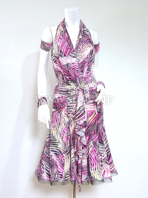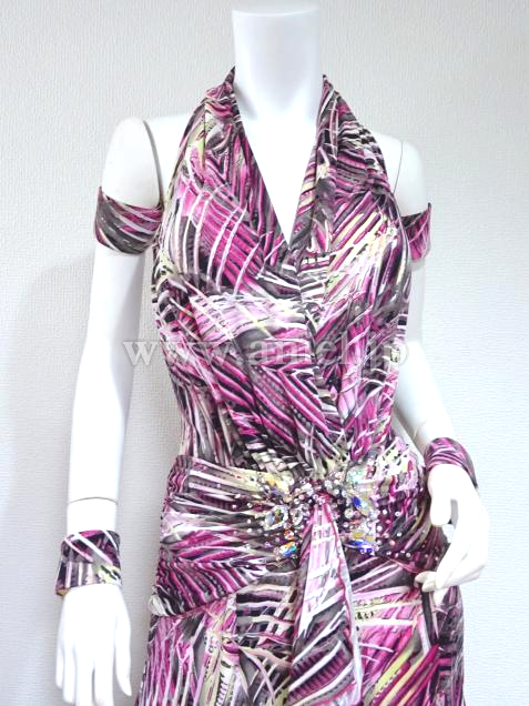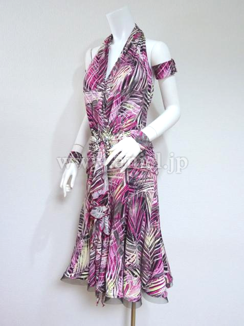 ピンクの柄生地を使ったワンピース型ドレス。