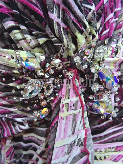 ギャザーを寄せて引き締めを作っているウエスト部分やヒップには大小のスワロフスキーストーンが装飾されています。