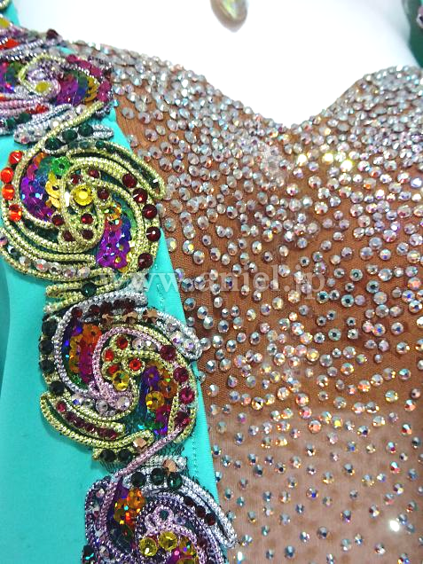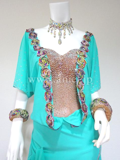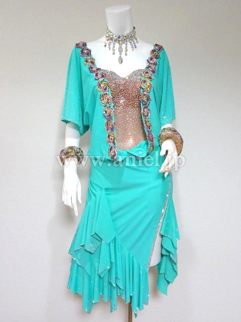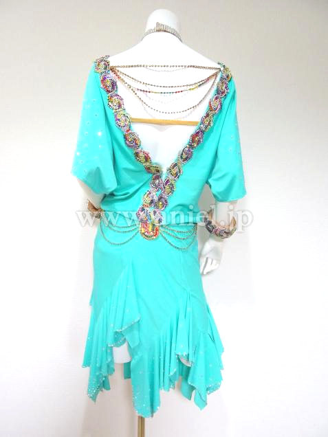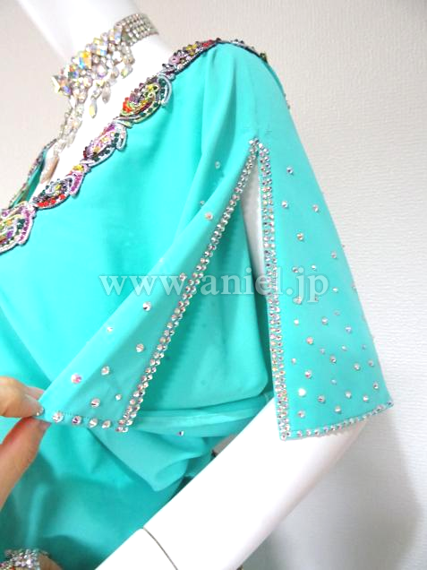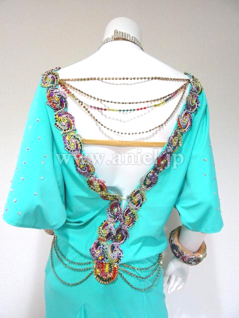 鮮やかなクールアクアがフロアで目立ち、個性的なモチーフの装飾がインパクトのあるドレスです。