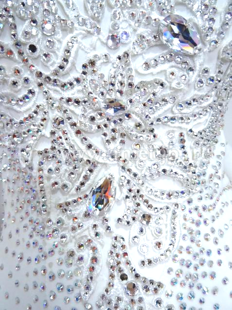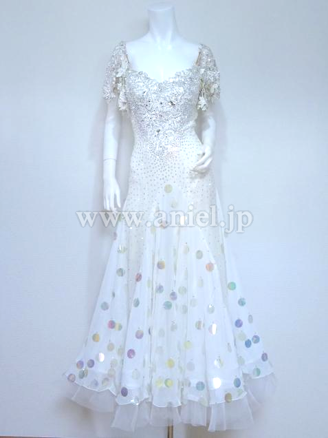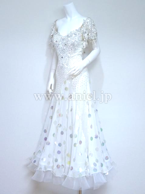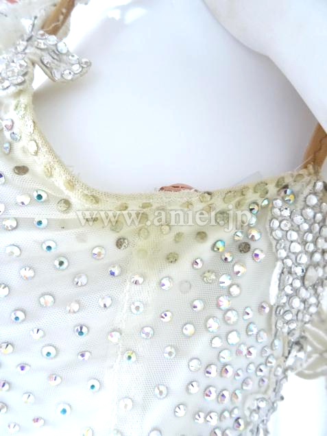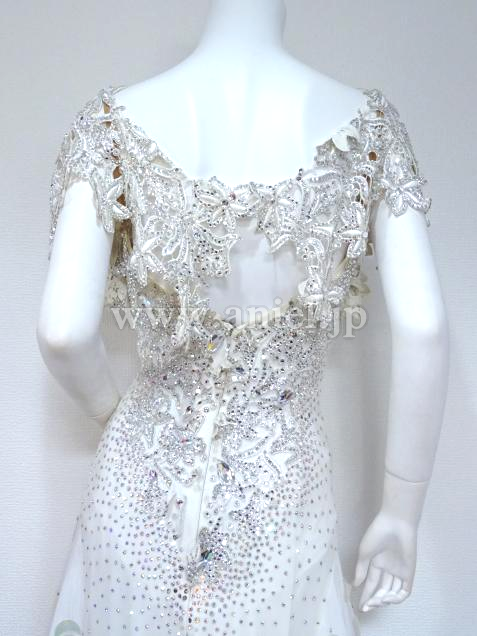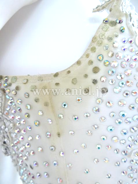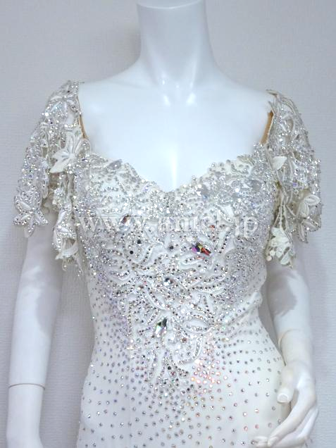スカートにはスパンコールが散りばめられ、ボディや肩にかかるレースはスワロフスキーストーンがたっぷり使われ非常に豪華。