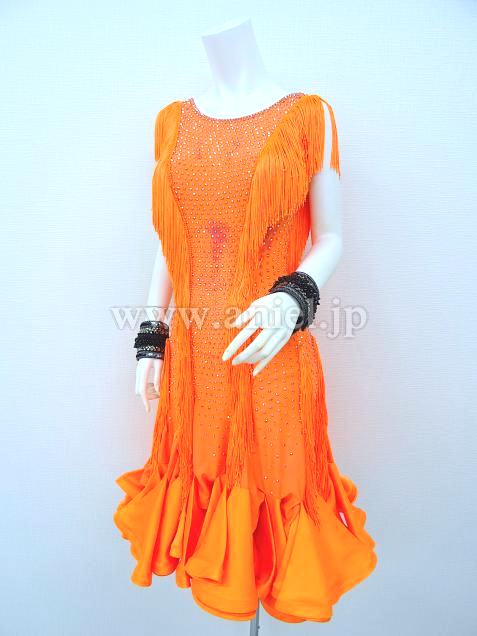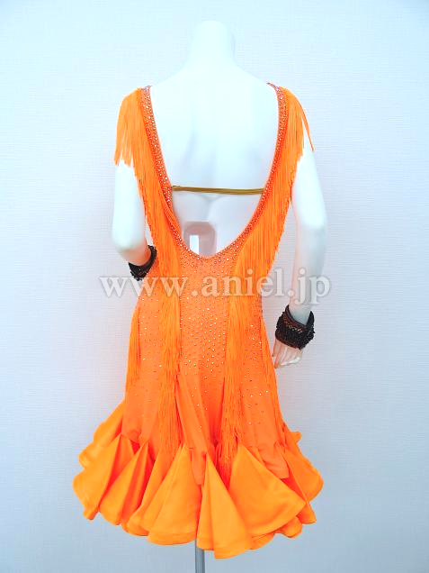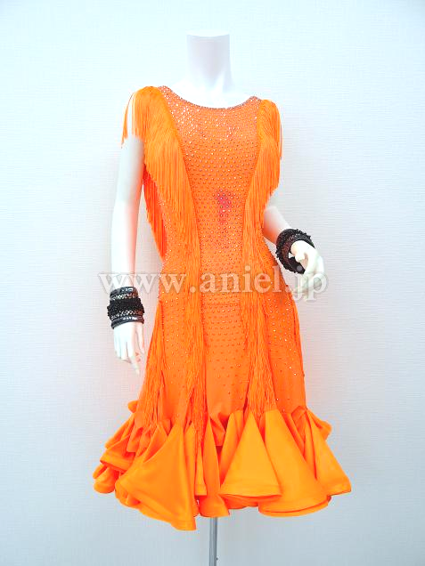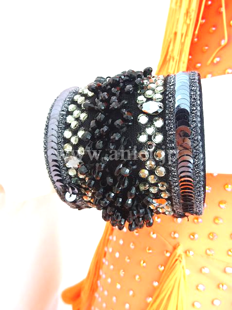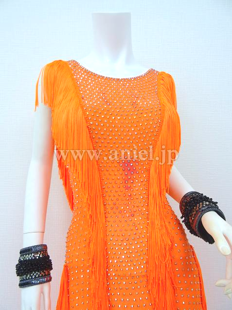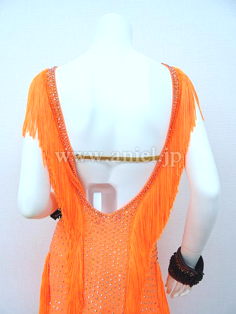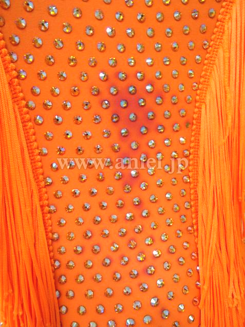 全身が隠れることがないので、体のラインを美しくみせ、とてもよく踊るので全種目向けのデザインです。イギリスのDSIの素材で制作されていて、使われている石は全てスワロフスキ。職人技の美しさで、ヒヤシンスAB(オレンジのスワロフスキ)の石が整然ときっしりと貼られていて強く輝きます。石びっしりの立体的な両手首用の黒のバングルが付属しています。縫製の美しさと着心地の良さは最高級クラスで大変動きやすくインパクトがあって美しいドレスです。
