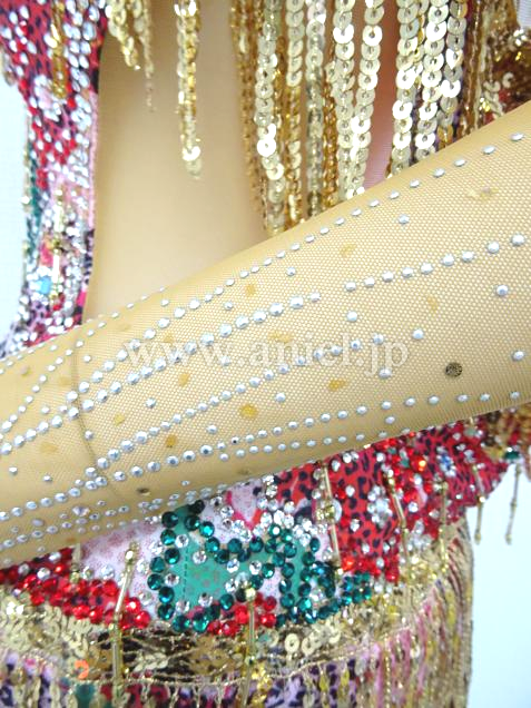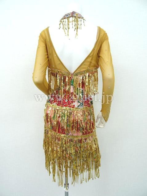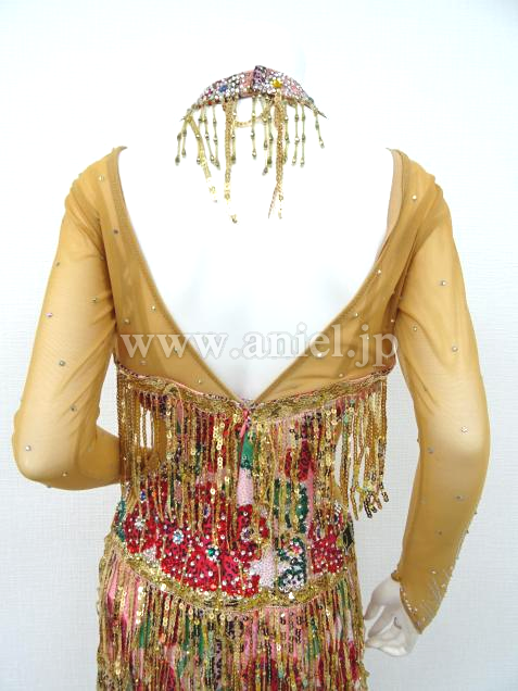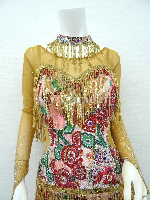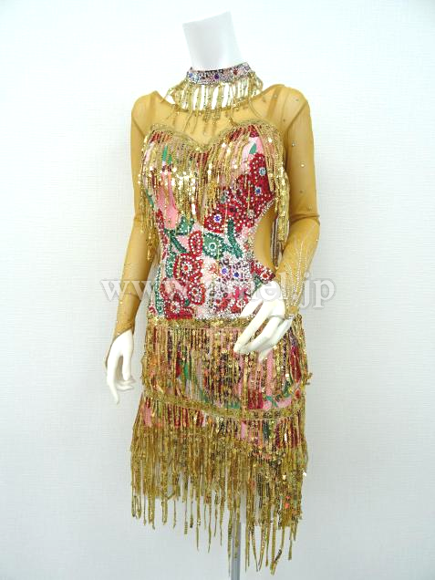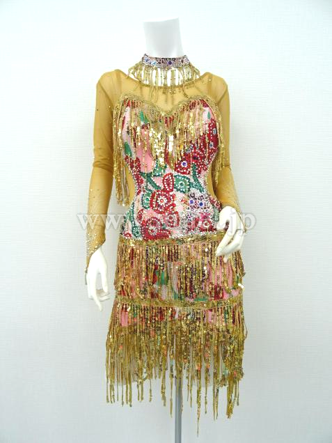 花柄のボディが珍しく、ゴールドスパンコールのフリンジがキラキラときらびやかなドレスです。