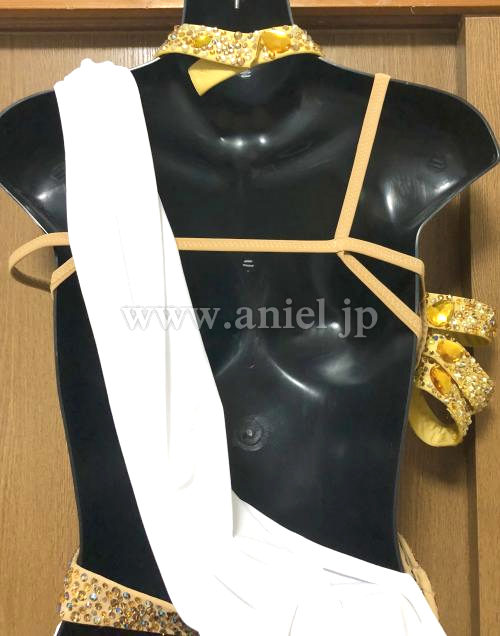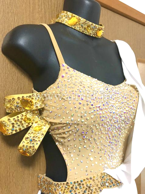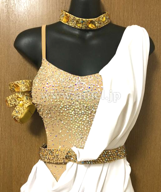 ベージュのボディに白い布がかけられたラテンの雰囲気をよく出せるドレスです。