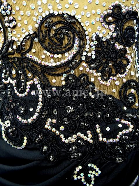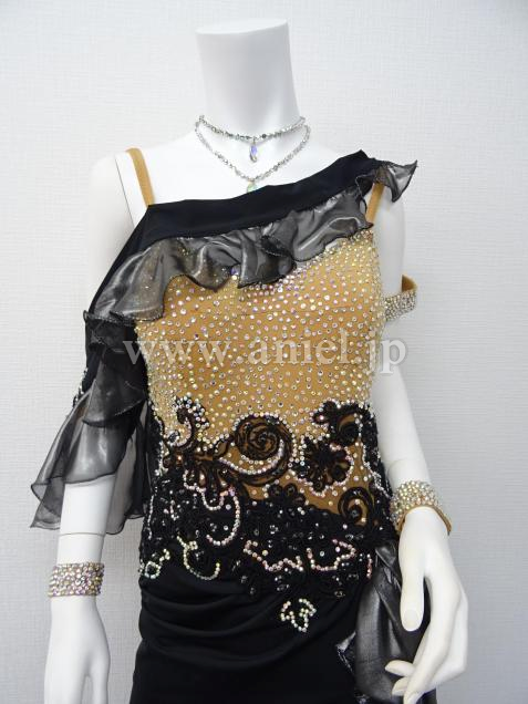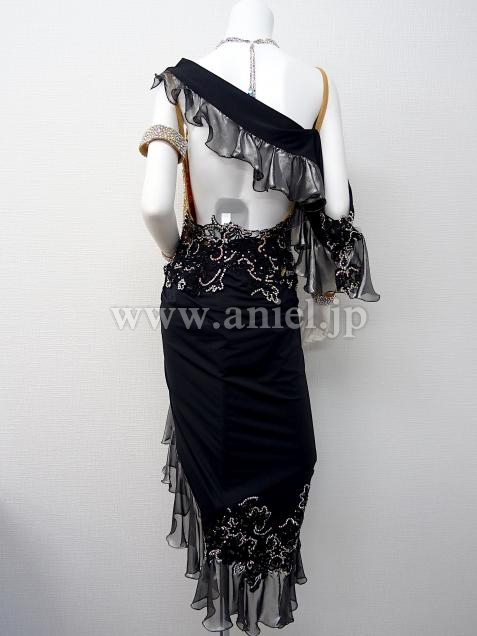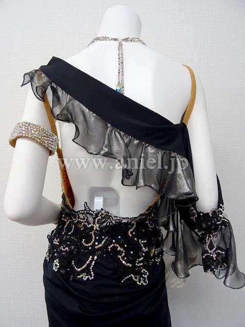 上半身がヌーディーでウエストから続く飾りが裾でヒレの様に見えて人魚の様なイメージ。後ウエストの飾りによって足長効果あり。左肩から続く右手の飾りが動きを大きく見せます。