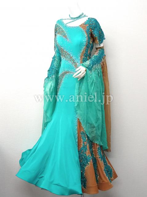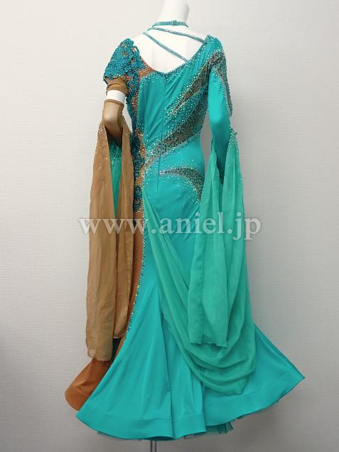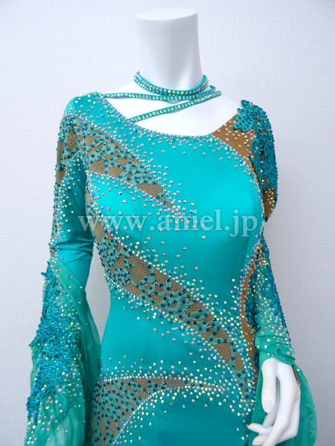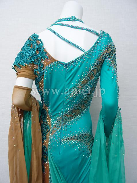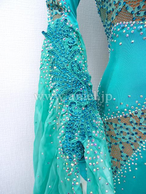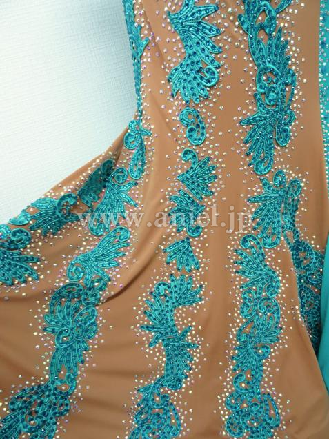 ヌーディカラーの生地にはジェードのモチーフレースとストーンが装飾され華やか。