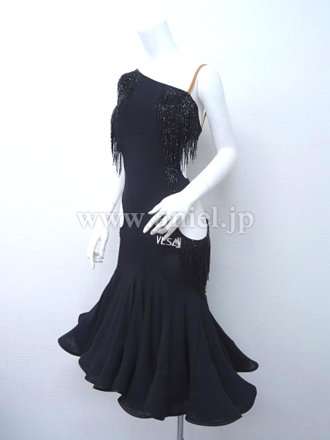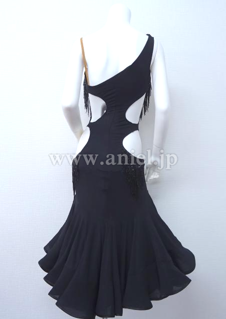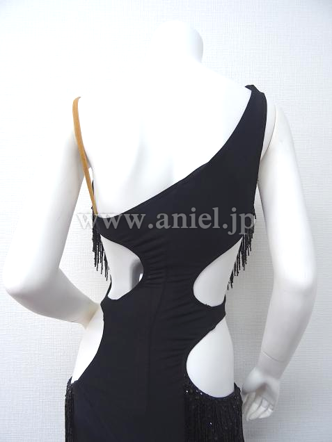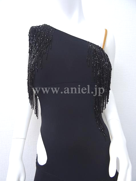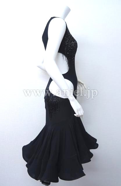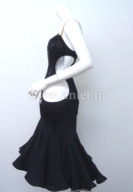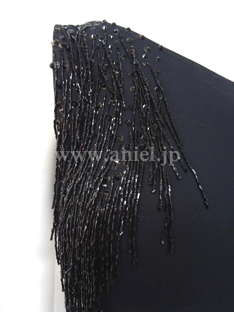 胸元やヒップサイドにはストーンとビーズフリンジの装飾が施されています。