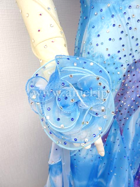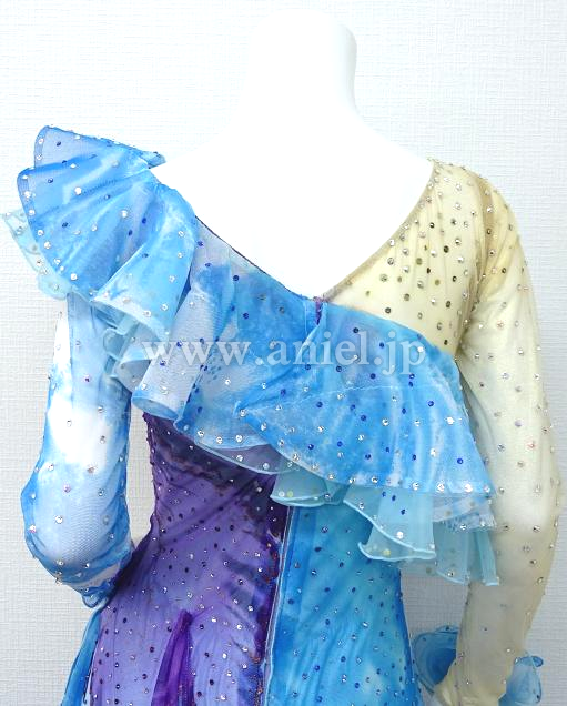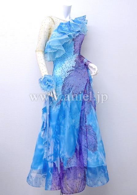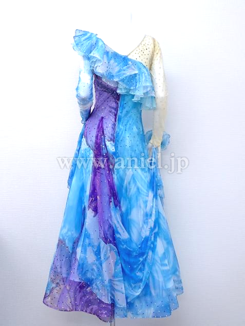 水色と紫の柄生地を使ったエレガントなドレスです。
