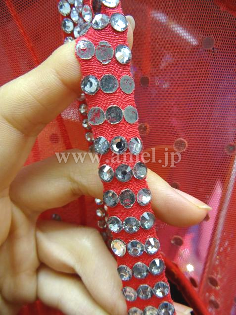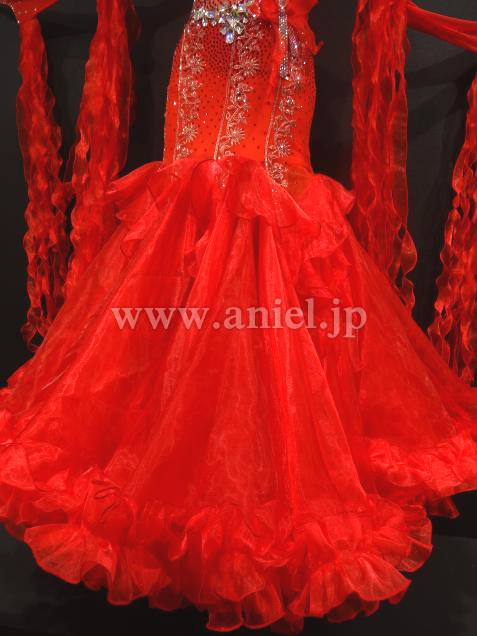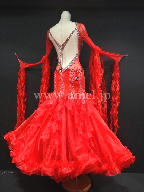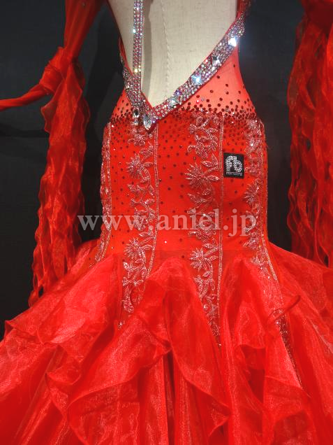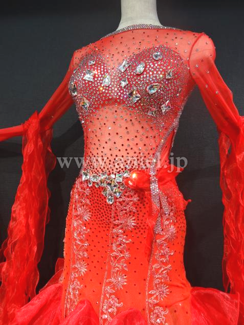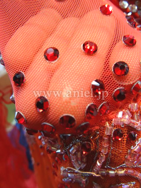 ボディは繊細な赤のメッシュ生地で袖付きですが重たい印象にはなりません。