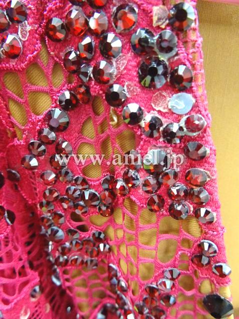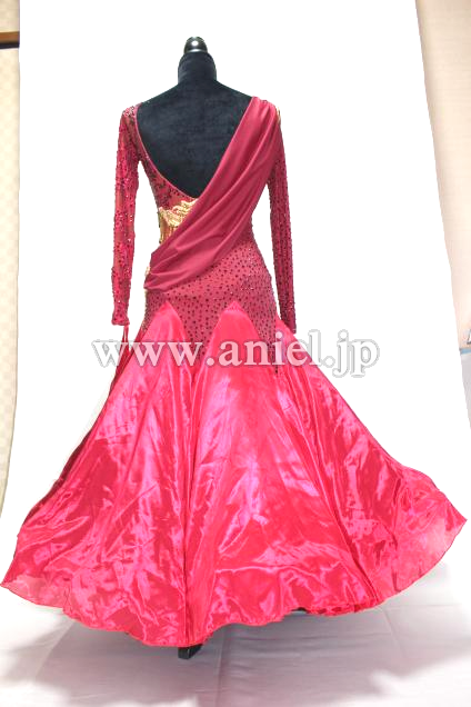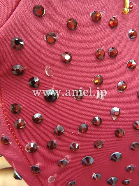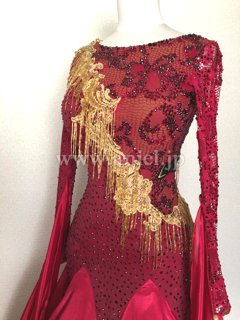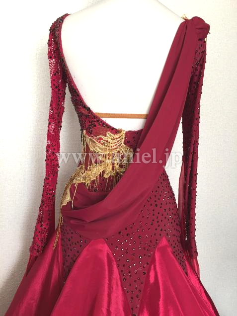 ワインレッドにゴールドの竹ビーズが素敵なドレスです。光沢あるスカートはボリューミーでとても軽く良く舞います。ストーンはプレシオーサが使用されています。