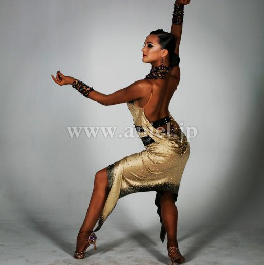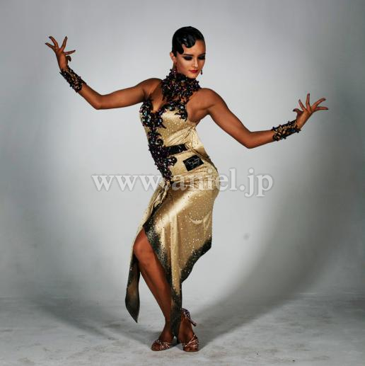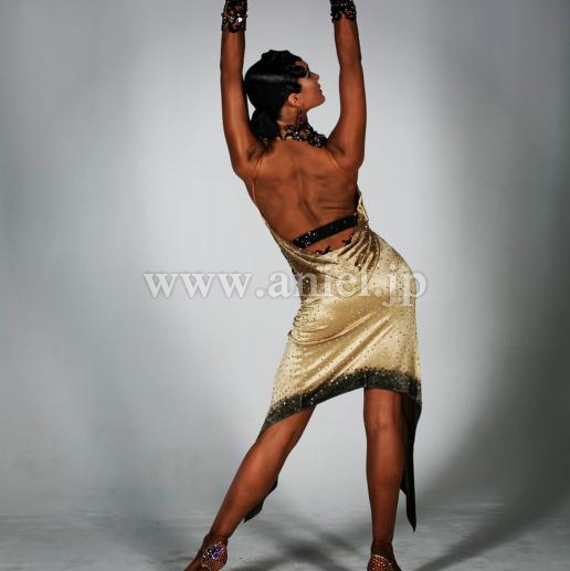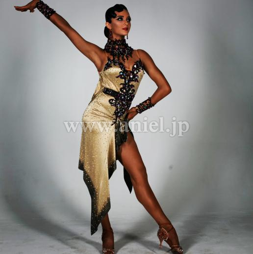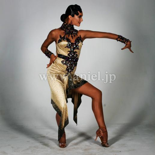 光沢のあるゴールドの生地。腰下までスワロフスキーがついています。裾は黒のグラデーションになっていて縁取り効果あり。作りの凝ったネックレスとボディの飾りが連続しているように見え、非常にゴージャス。飾りに紫色の石が使用されていて華やかです。股下は開閉できるようになっています。