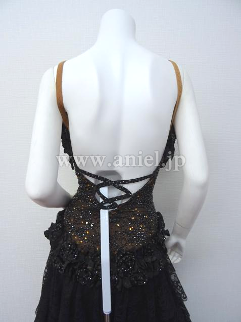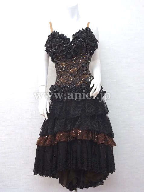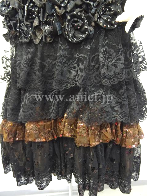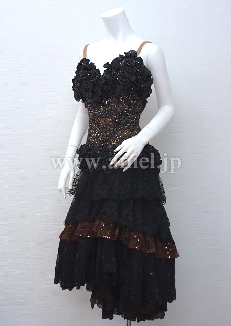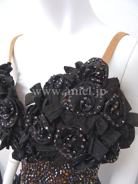 ボディはストーンたっぷり。胸元や腰回りは立体のフラワーモチーフで装飾されています。