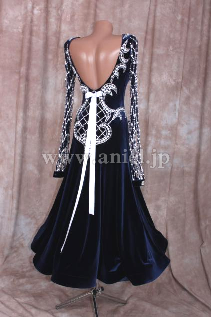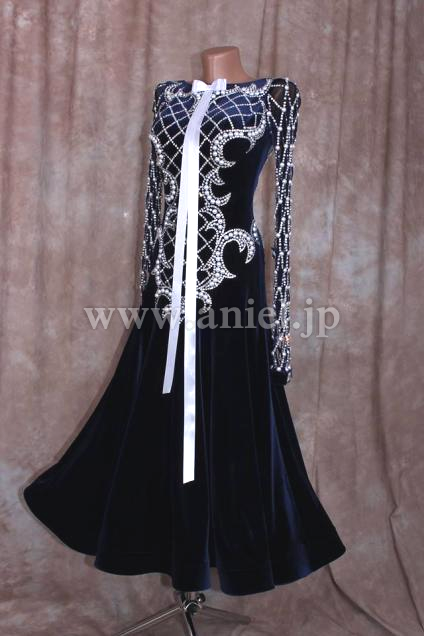 伸縮性のあるネイビーのベルベット生地。格子状に貼られたスワロフスキーと、アラベスク文様を象った大粒パールが大変豪華。前面・背面両方にあります。袖はパフスリーブで、粗いネット状の細紐に大粒パールと石がびっしりついています。胸元と背中についている白いリボンが清楚なイメージ。上品なドレスです。股下は開閉式になっています。ピアス付き。