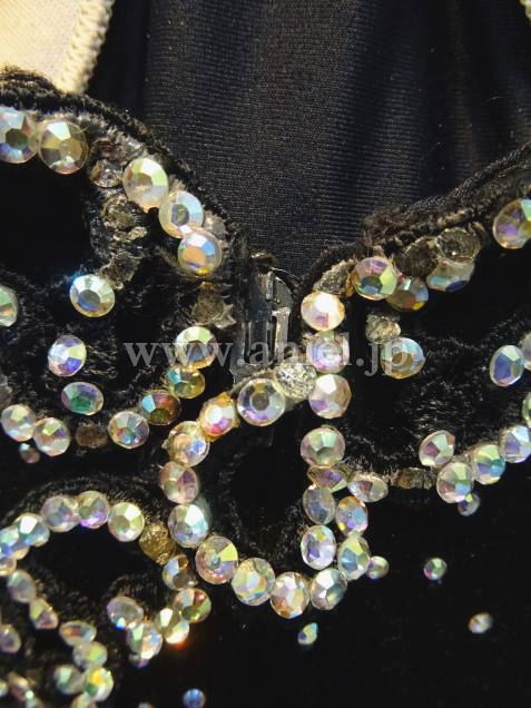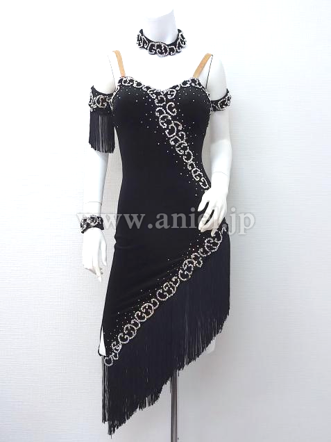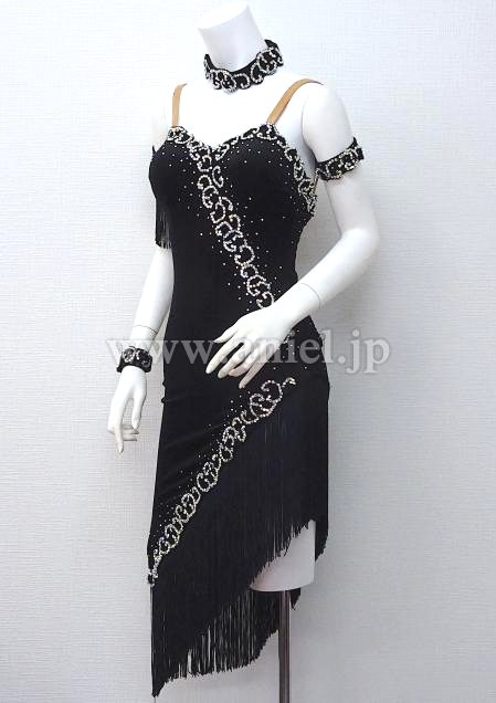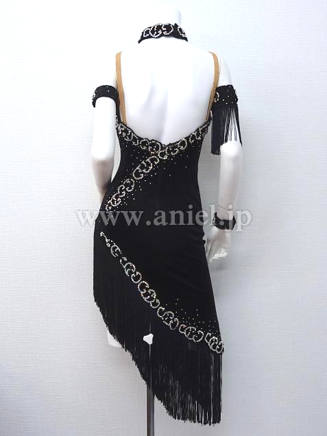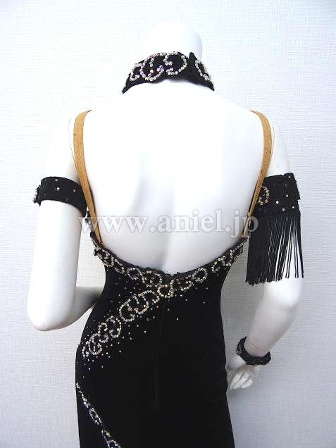 黒のベルベット生地のボディにモチーフレース、オーロラストーンが装飾されたドレス。