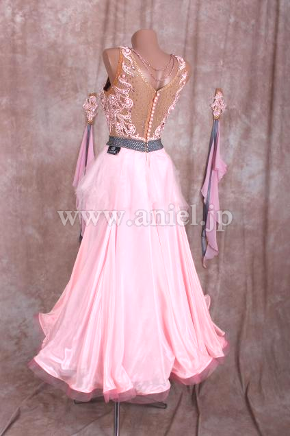 可愛らしいベビーピンクのドレスです。ボディはモチーフレースにパールとストーンで華やかに装飾されています。