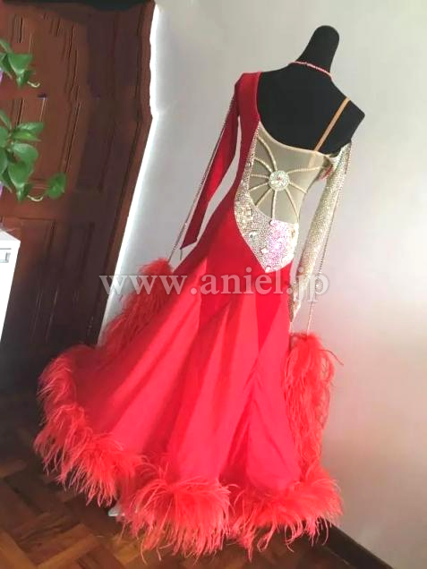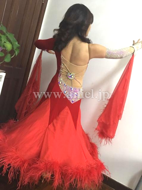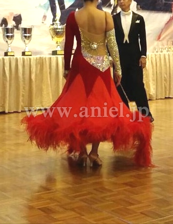 ボリュームのあるスカートの縁には羽根がたっぷりつけられ豪華。