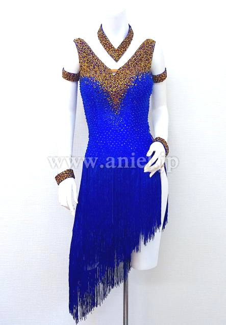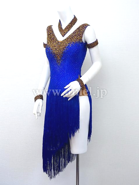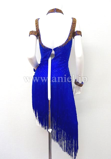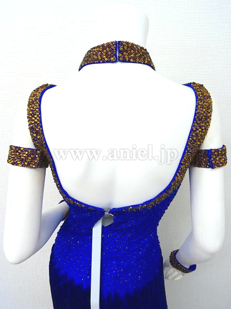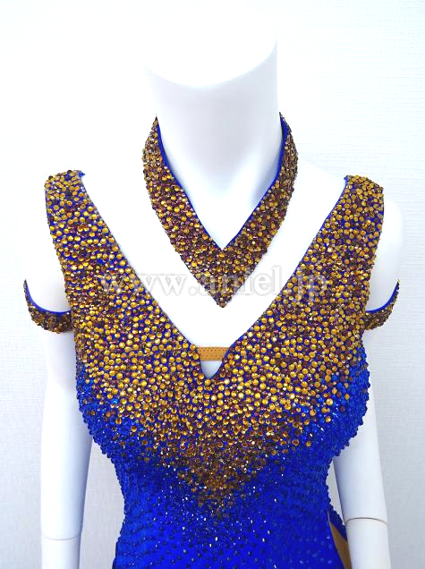 綺麗な青にトパーズのストーンが胸元肩に沢山ついています。