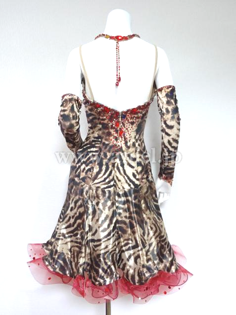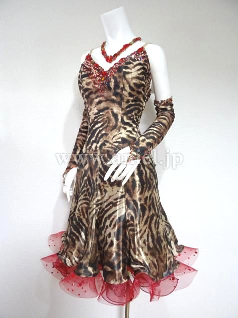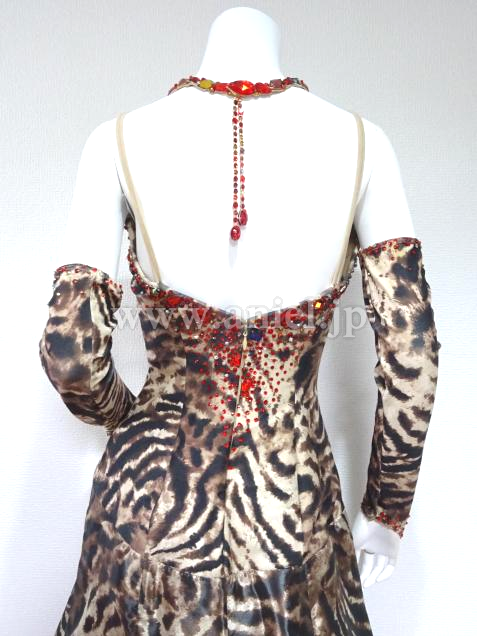 全身豹柄ですか、シフォン素材のため軽やかな印象です。豹柄特有のどぎつい印象はなく、上品な仕上がりです。総柄のため、あえて石を少なくした分、首飾りはゴージャスです。