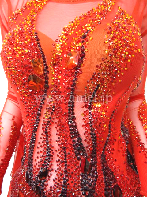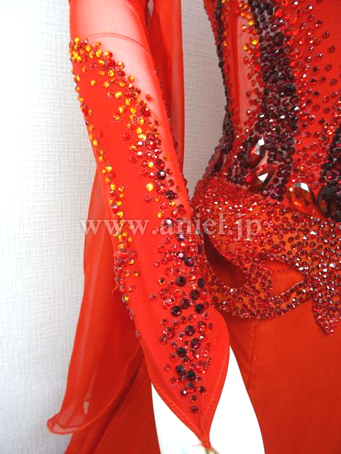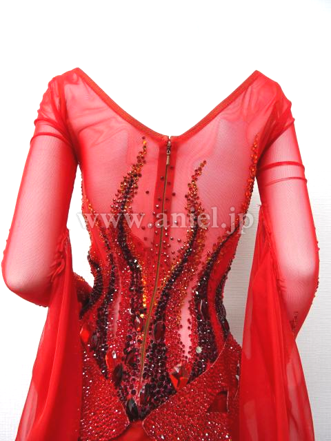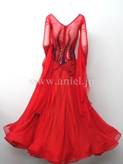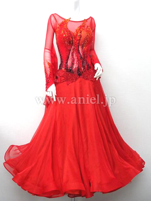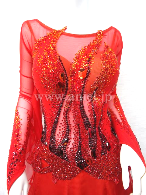 鮮やかな赤いドレスです。長袖の赤のメッシュ生地で透けます。